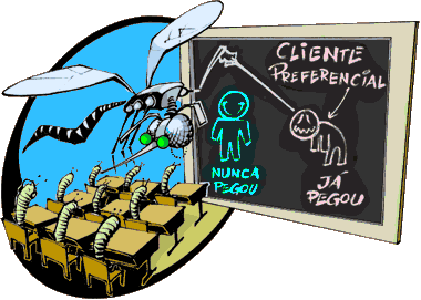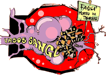 Dentro do corpo a coisa também é complicada. Como os vasos ficam frágeis, se houver vazamento de líquidos do sangue, eles podem se acumular na pleura (membrana que envolve o pulmão) e no abdômem. O doente pode entrar em estado de choque. E nesses casos, a dengue pode matar. Os sintomas são bem chatos: febre alta, dores em todo o corpo, principalmente nas articulações e nos olhos, dor de cabeça, fraqueza, gânglios (pequenas bolinhas) nas axilas, náuseas, vômitos. Por isso, se você sentir esses sintomas, não perca tempo: procure um médico! Não existe remédio para a dengue. Só repouso, beber bastante líquido, e evitar remédios à base de ácido acetilsalicílico (a famosa aspirina). É que a aspirina não combina com a dengue. Apesar de baixar a febre e diminuir as dores, a aspirina diminui a capacidade de uma plaqueta aderir à outra, facilitando as hemorragias. Mas… como é que se pega a danada da dengue?